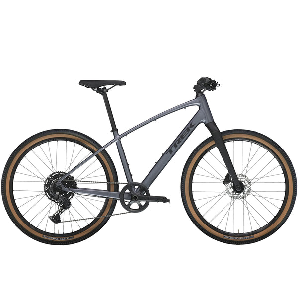 The Dual Sport 3 is a high-performance, go-anywhere hybrid bike that transitions from the road to rougher terrain with ease. It has a light frame and a simple 1x Shimano CUES drivetrain with a wide range of gears. Its wide Bontrager Kovee wheels and wide gravel tyres soak up bumps and rough-terrain for a comfortable, confident ride on roads, rail trails and light dirt paths.