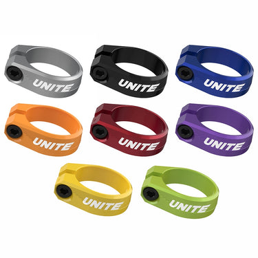 Unite Seatpost Clamp 34.9mm The Unite Seat post Clamp is CNC-machined to shed excess weight and matches perfectly with the rest of the Unite component range. Features: CNC machined in house from 6082 Alu Black Stainless Steel bolt Available in 8 colours - Black, Orange, Red, Blue, Purple, Green, Silver and Gold Availab...